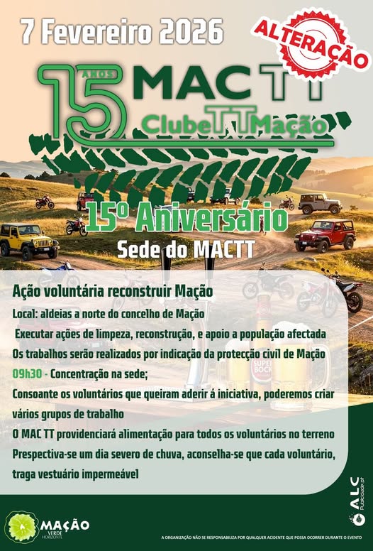 Concentração dia 25 de Setembro de 2025 às 08H00, entrada Sul da pista de Autocross de Mação em local previlegiado. Comida e bebida fornecida pelo MAC TT em modo self service para os participantes inscritos.